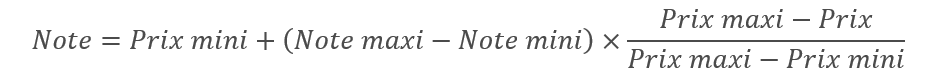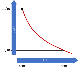 Il s’agit donc d’une formule hyperbolique qui atténue les écarts de notes pour les prix très bas et rend impossible l’obtention de la note 0/10.