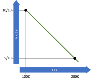 Comme la méthode dite de GRAMP, celle-ci tient compte de ces écarts de prix proposés. Cependant, plutôt qu’une évolution « courbe » en hyperbole, ici on trace tout simplement une droite entre les 2 points extrêmes précédents (100 € ; 10/10 et 200 € ; 5/10) ? Plus simple à dire qu’à calculer, car la formule devient :