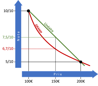 Comparons avec la formule de GRAMP en gardant le même exemple : pour le prix médiant de 150 € on obtient la note (médiane) de 7,5/10 pour la formule avec valeurs encadrantes et 6,7/10 pour GRAMP.
