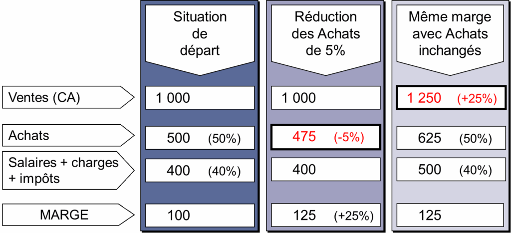 Dans cet exemple très représentatif, l’entreprise dégage donc au départ une marge de 100, soit 10% de son CA. On constate qu’un gain de 5% seulement sur les dépenses achats, toutes choses égales par ailleurs, produit un effet 5 fois plus important (+25% d’augmentation de la marge). Pour obtenir ce même effet sur la marge, calculons maintenant l’effort à fournir par la force de ventes, toutes choses égales par ailleurs, enfin presque… En effet, le seul moyen réaliste d’améliorer le montant des ventes est de vendre davantage de biens et en conséquence d’acheter davantage. Au final, il faut vendre 25% de plus, donc tout l’effort va directement dans la marge sans effet de levier. Conclusion, les achats sont 5 fois plus efficients que les ventes (même résultat avec 5 fois moins d’effort).