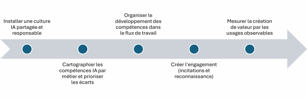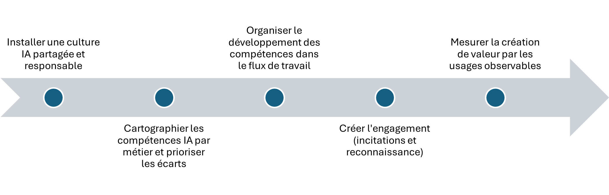 | Tirer parti des pairs | Identifier et valoriser les "champions IA" dans l'organisation | Diffusion des bonnes pratiques et effet d'entraînement |