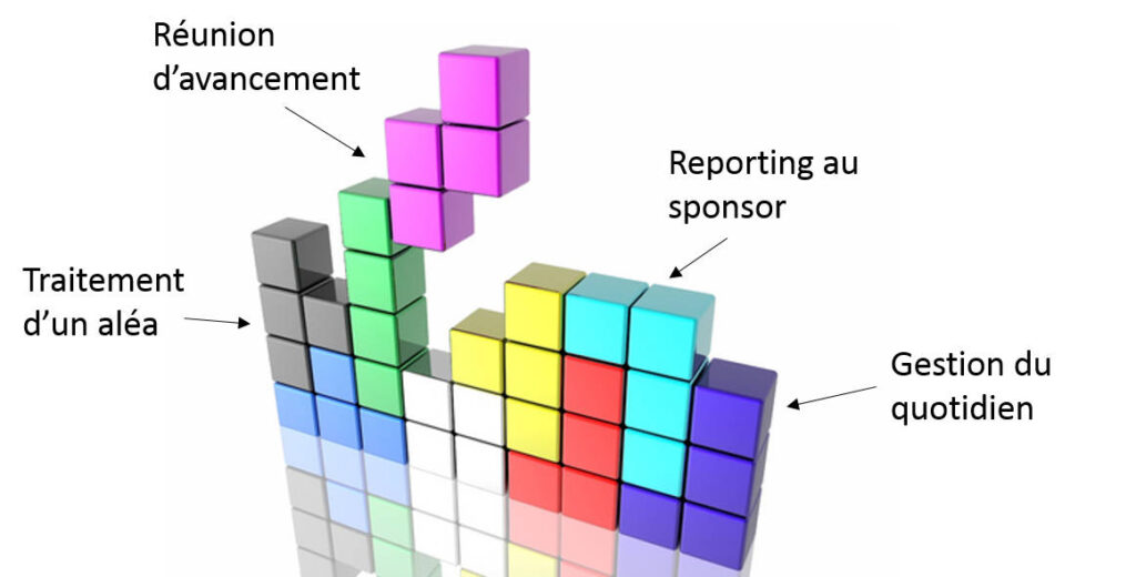 La semaine de travail d’un chef de projet ressemble souvent à ce jeu, où les activités courantes et celles qui sont liées aux projets (initialiser le projet, constituer l’équipe, établir le planning, contrôler les coûts, préparer et animer des réunions d’avancement ou de travail, rendre compte au comité de pilotage, développer et entretenir un réseau de communication efficace avec les parties prenantes…) sont autant de tétriminos qui tombent, et pas toujours aux endroits opportuns pour que ça rentre !