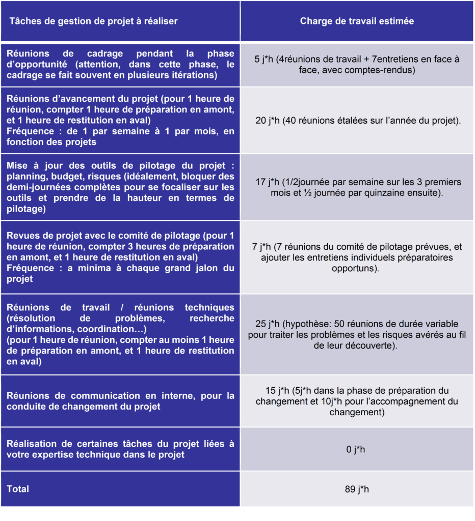 De la même manière qu’il est difficile d’estimer le budget pour produire un livrable sans en connaitre le périmètre et les exigences de performance, il convient de clarifier les missions du chef de projet pour évaluer sa charge de travail.